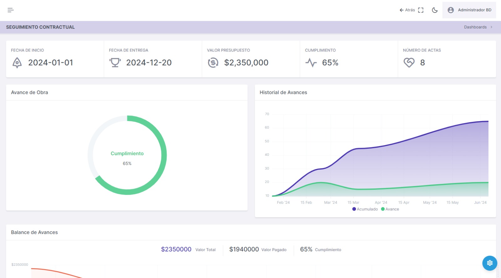 Permite realizar el seguimiento de la ejecución de los contratos de obra pública de la Entidad, mostrando gráficamente el control de plazos y tiempos de programación/ejecución, alertando cuando haya retrasos en la ejecución de los contratos, seguimiento de actas, control documental como pólizas, seguridad social, etc. alertando si hay documentos faltantes o próximos a vencerse, entre otras funcionalidades.