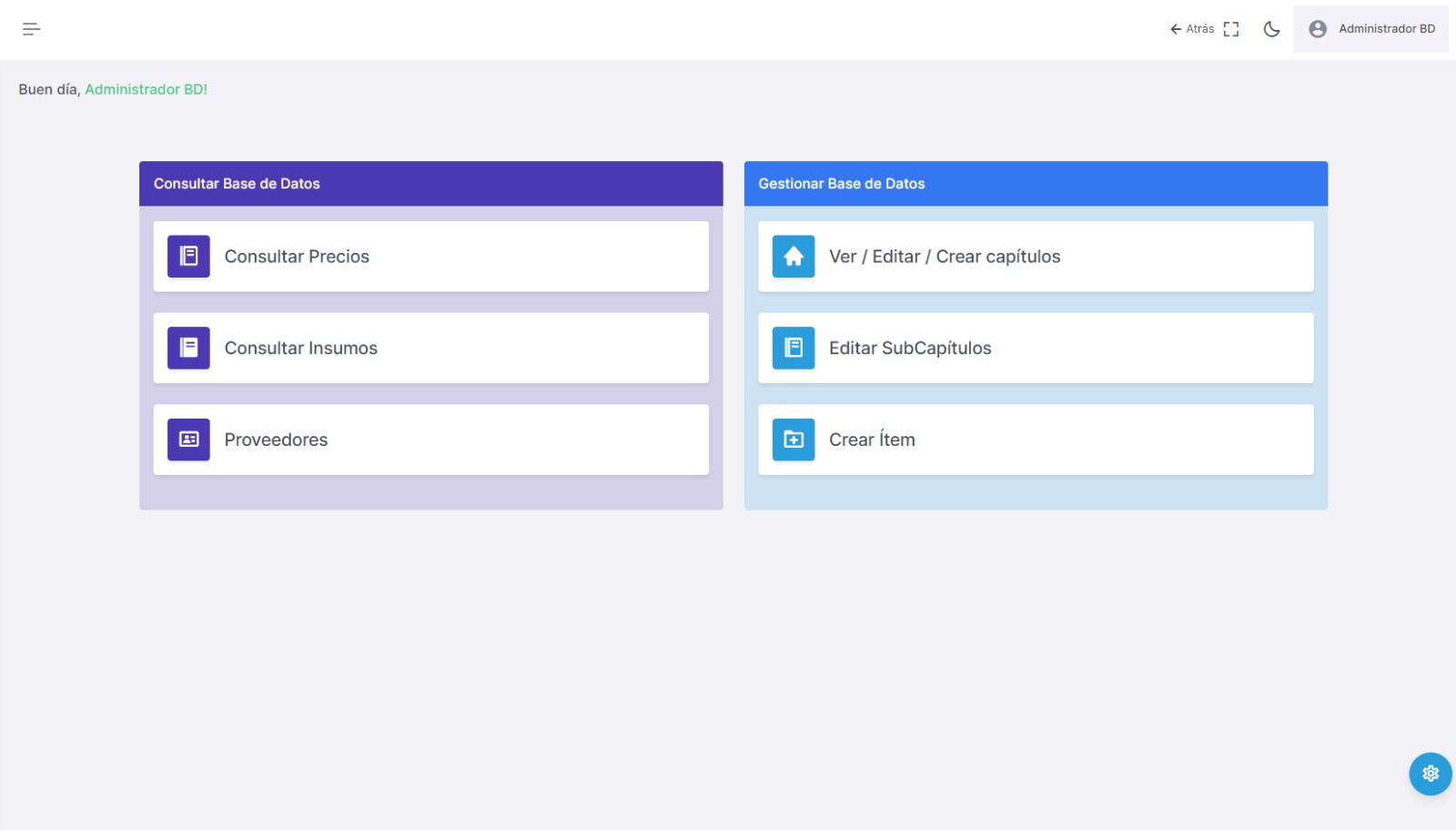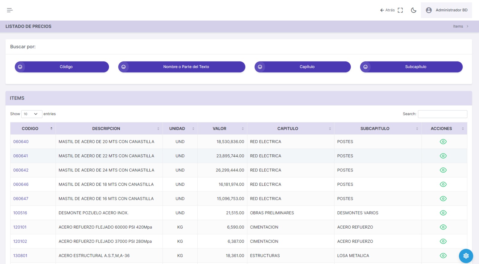 Permite la generación y manejo de una base de datos de precios oficiales y la elaboración de presupuestos online, multiusuario y con disponibilidad 24/7 para cualquier dispositivo.